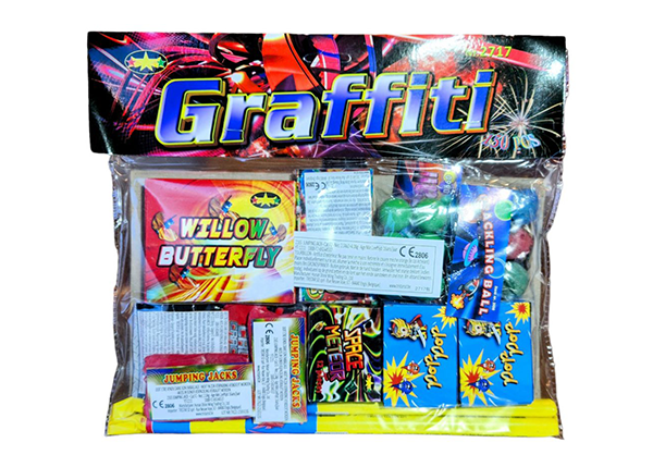 Het graffiti assortiment is categorie F1  wat heel het jaar door gebruikt mag worden en bestaat uit : crackling flowers , crackling balls, vlinders, romeinse kaarsen, mini knalerwten ,pili crackers, jumping jacks, crush crackers